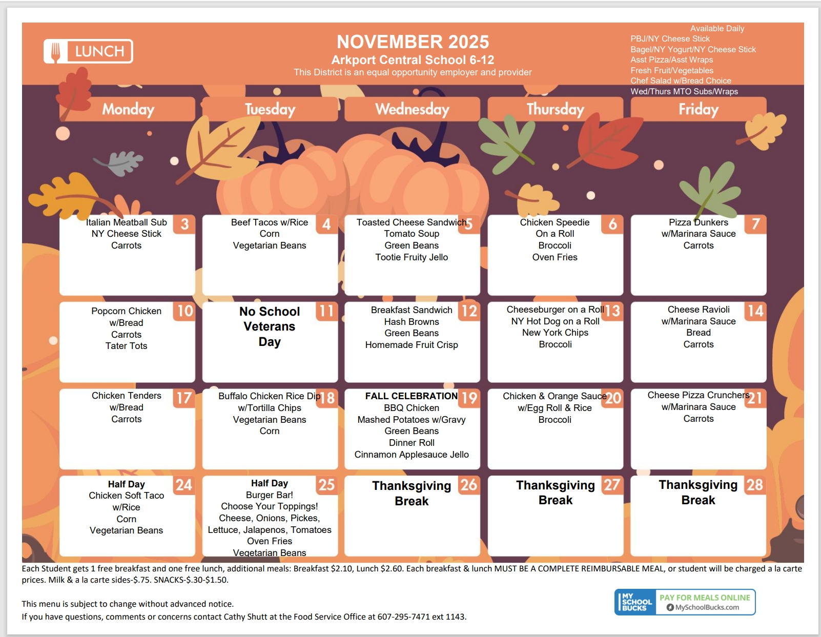 Just a reminder that breakfast and lunch are free for all students each day. We offer many entrée choices, along with fresh fruits and vegetables daily.