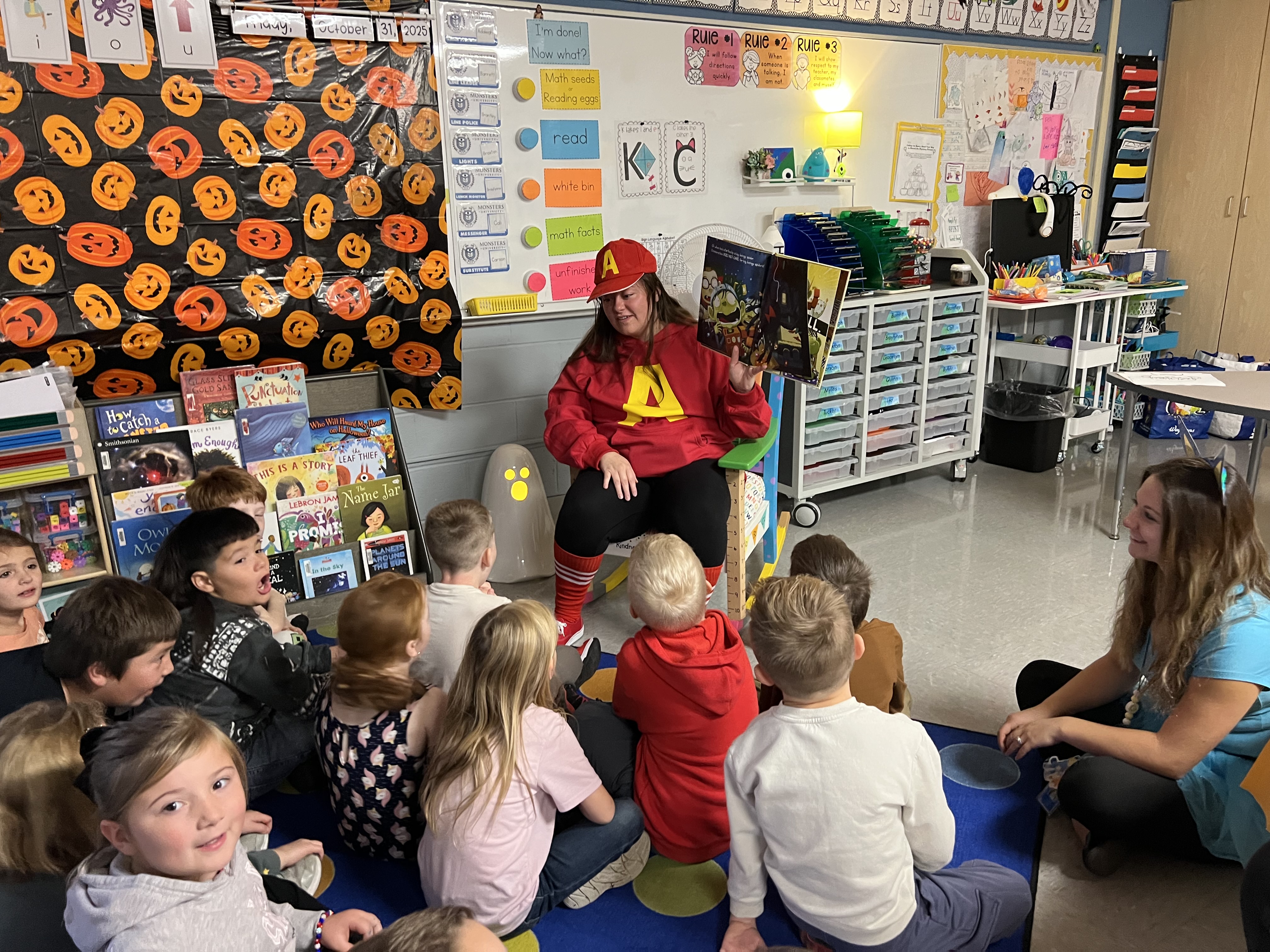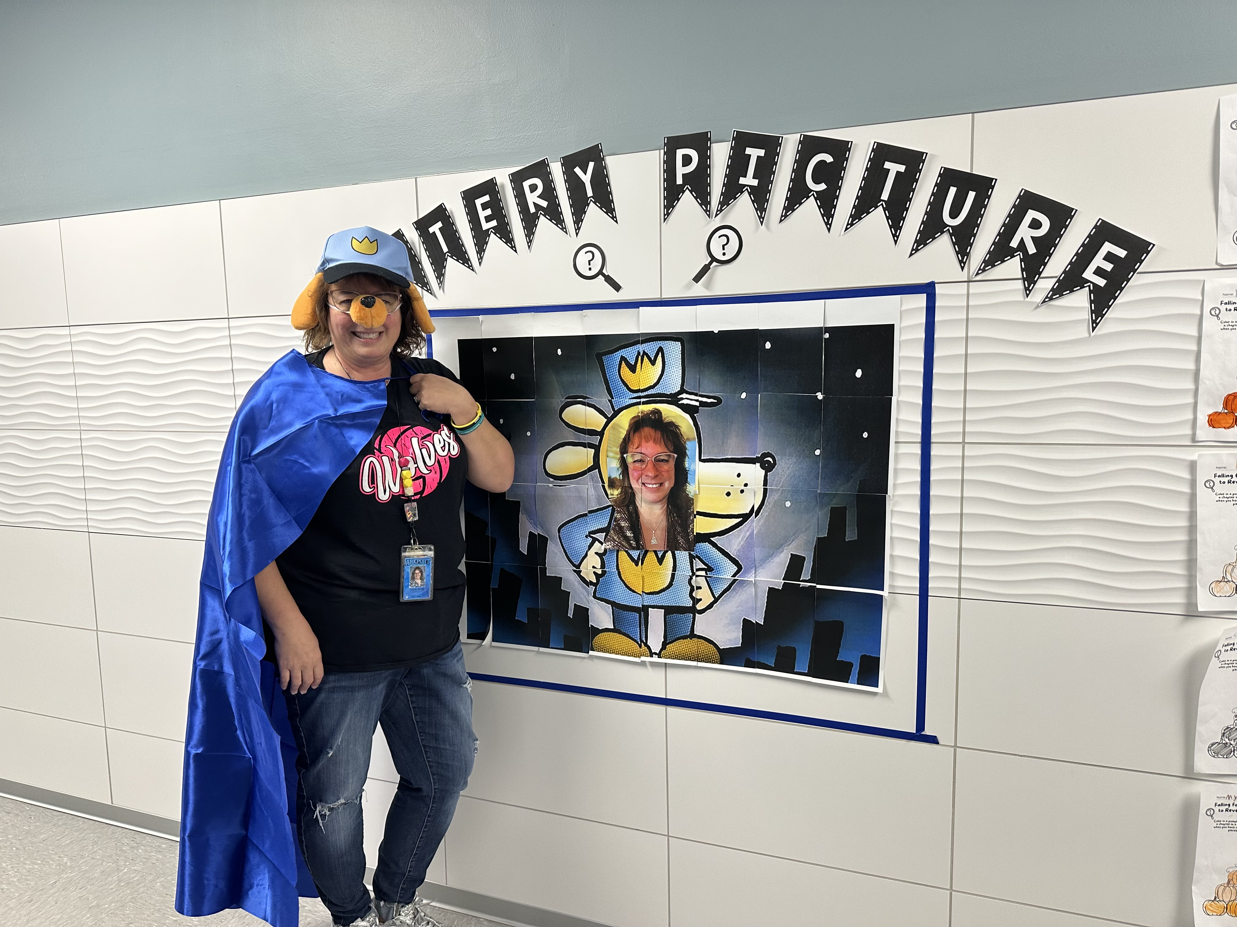 Reading Challenge Recap: We have wrapped up our October mystery picture reading challenge. Students enjoyed listening for clues to the mystery picture and reading to earn pieces of the picture over the course of the month. We received 168 pumpkin papers each equaling 10 books or 10 chapters in a chapter book. Thank you so much for encouraging such wonderful participation! Our picture even came to life on Halloween with Dog Man Smith making an appearance to each classroom!