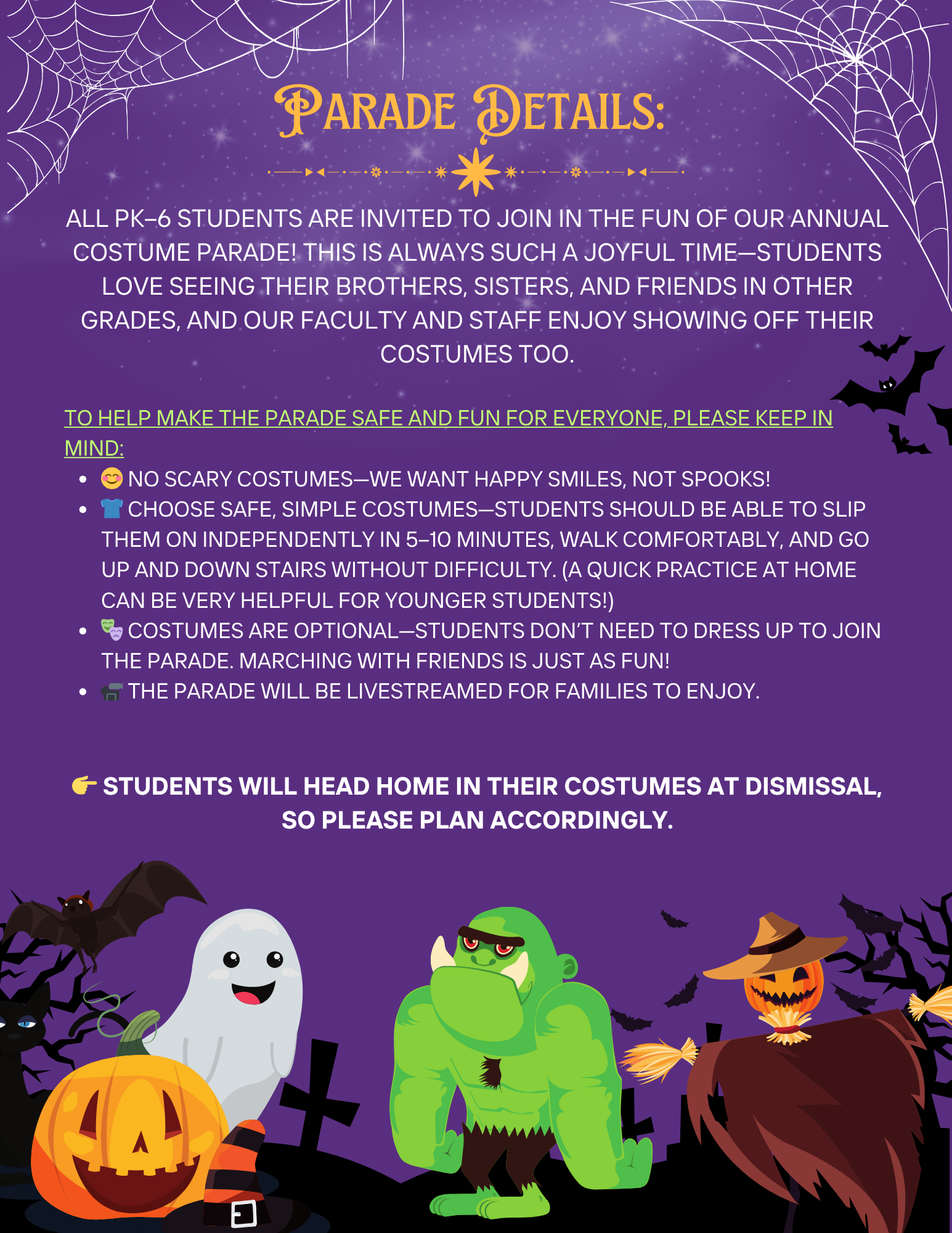 Welcome to October! This month is full of fun, learning, and new adventures. As we move through the season, letās continue to show kindness, curiosity, and teamworkāremember, āTogether We Lead: Our Road to Success.ā